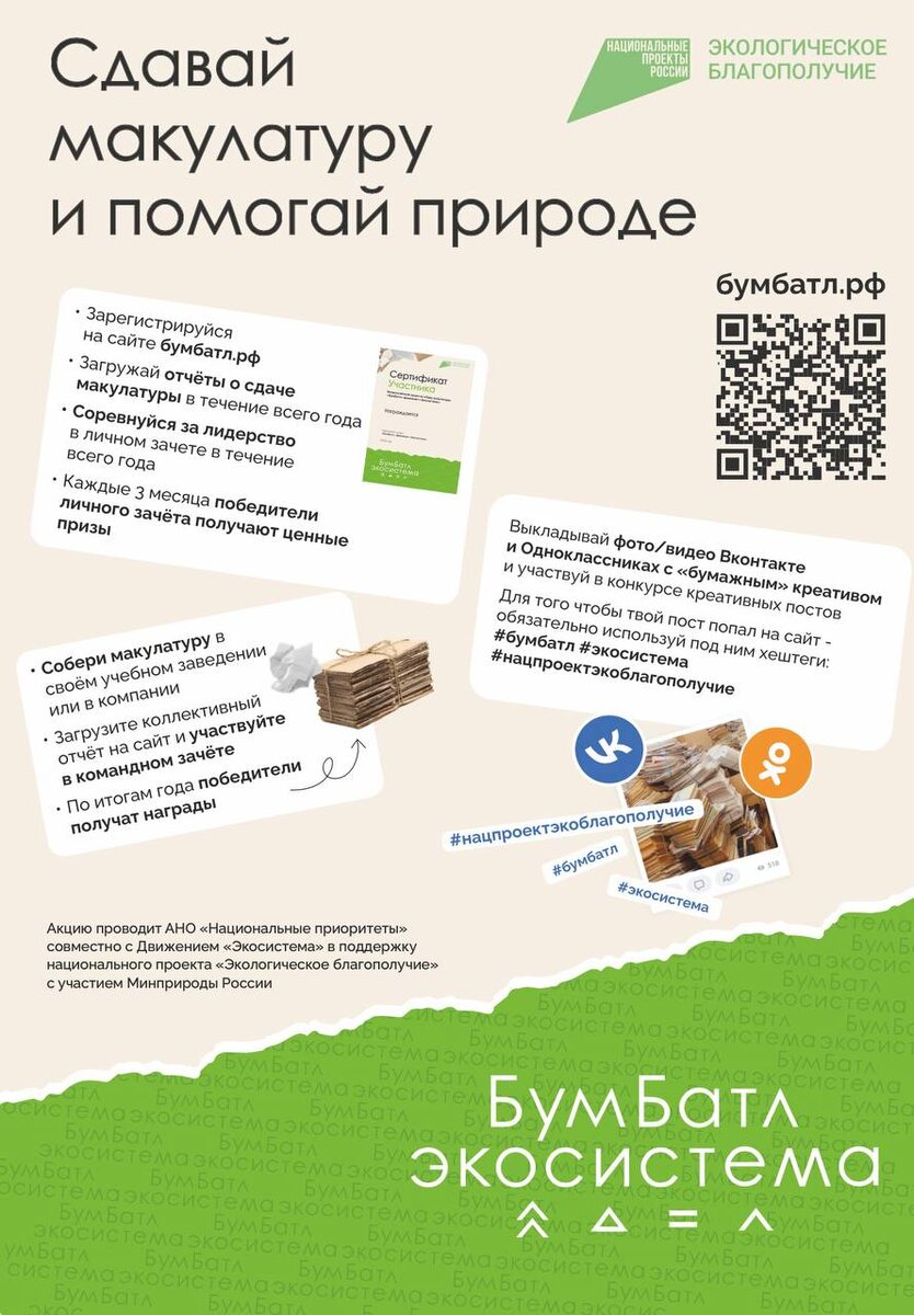 В России стартует осенний сезон акции «БумБатл»! 📰С 1 сентября по 30 ноября все желающие могут сдать макулатуру и помочь окружающей среде. 🌿Акция проходит уже в шестой раз. Её главная цель — научить нас бережнее относиться к природе и выработать полезные экологические привычки. 🎫Участвовать могут все: от детских садов и школ до сотрудников компаний. А главный бонус — за собранную макулатуру можно получить билет на концерт, в театр или музей.