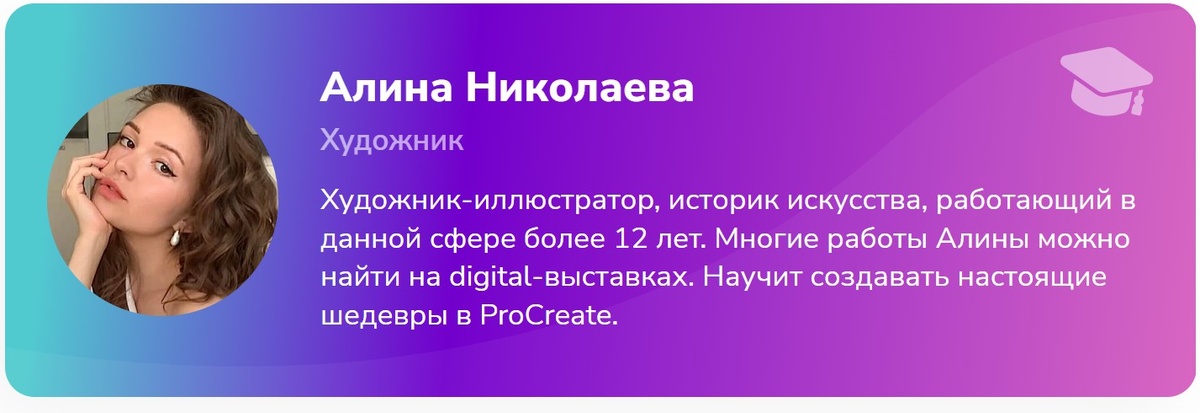 Автор курса: Алина Николаева — художник-иллюстратор, историк искусства, более 12 лет опыта, участник digital-выставок.