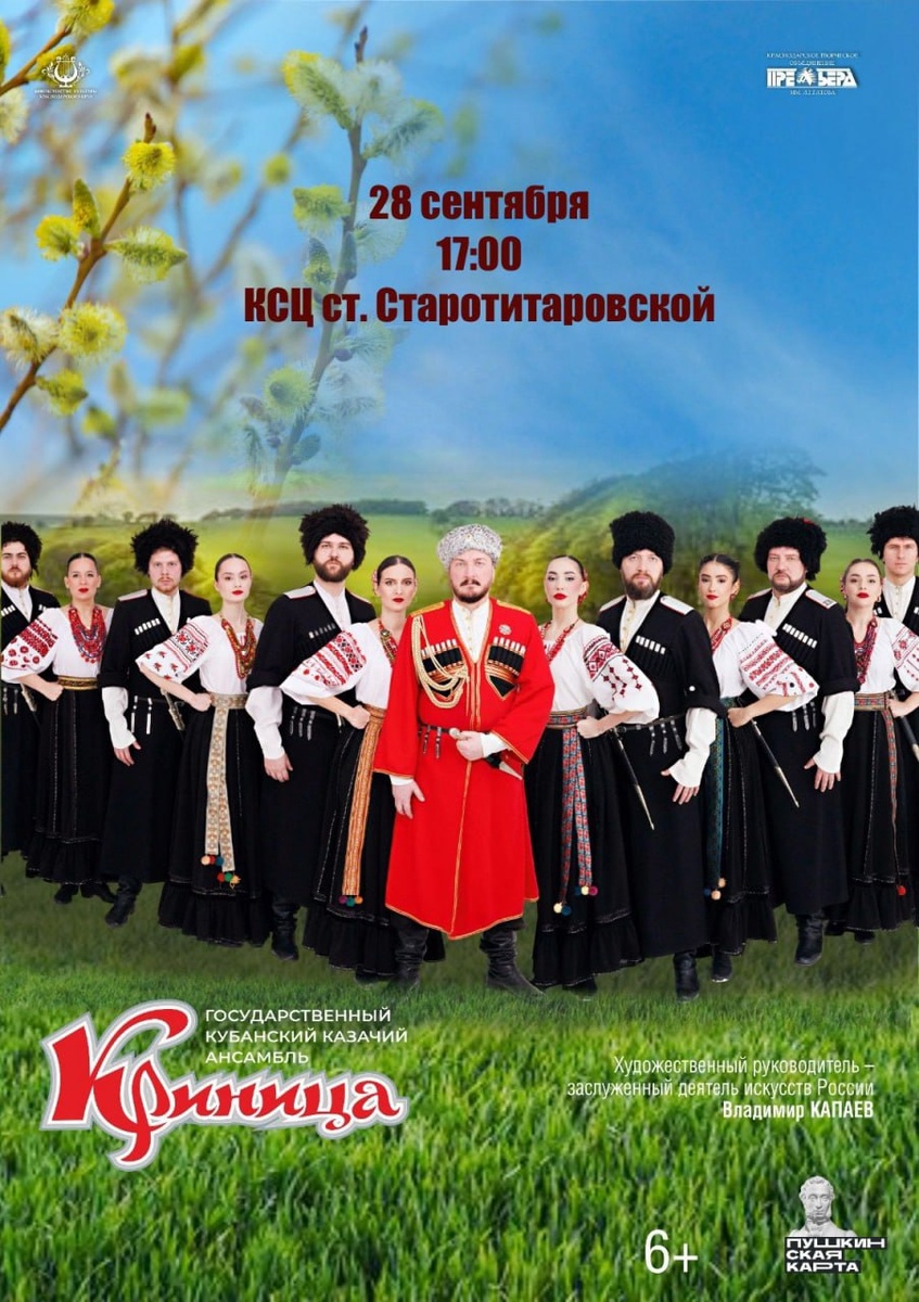 В исполнении одного из лучших профессиональных коллективов Краснодарского края зрители услышат патриотические и лирические произведения, традиционные казачьи песни, произведения о любви к Родине, о героических подвигах и мужестве защитников Отечества. И, конечно, ни одна концертная программа ансамбля «Криница» не обходится без ярких казачьих танцев и зажигательных инструментальных номеров, которые точно зарядят самыми положительными эмоциями! https://www.to-premiera.com/events/salyut-geroyam-gastroli-v-st-starotitarovskuyu/