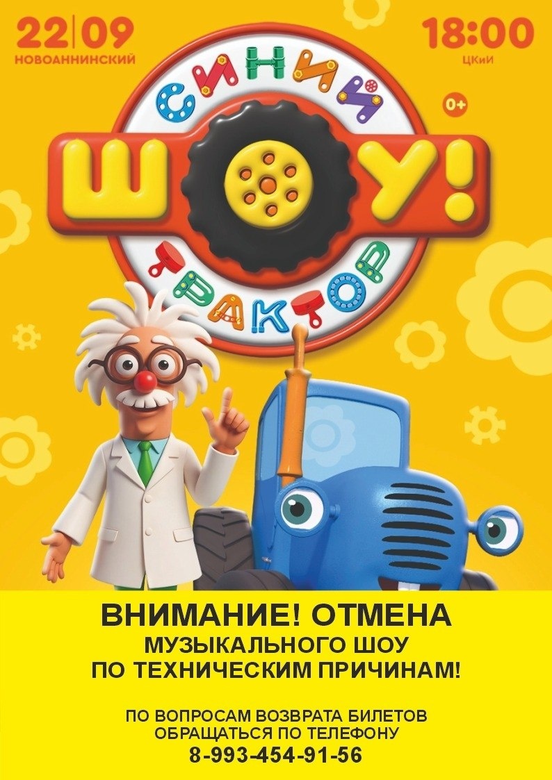 Уважаемые зрители! Музыкальное шоу "СИНИЙ ТРАКТОР", которое должно было состояться 22 СЕНТЯБРЯ 2025 года в 18.00 ОТМЕНЕНО по техническим причинам. По вопросам возврата билетов обращаться по номеру телефона: 8-993-454-91-56 ⚡️⚡️⚡️ Приносим свои извинения за доставленные неудобства❗️