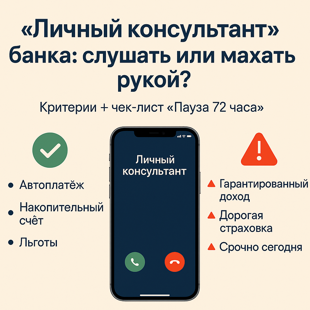 Иногда звонит «личный консультант» и уверенно предлагает «самое выгодное». Где правда, а где маркетинг? Давайте спокойно разберёмся и договоримся о понятных правилах. Что получите: короткие критерии «слушать/осторожно», список вопросов, мини-алгоритм «пауза 72 часа», 1 инфографика и баннер. Это сотрудник банка, у которого есть план продаж. Он может искренне помочь, но его задача — подобрать и продать продукт.