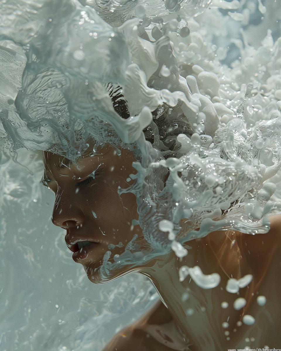 Water texture for autodesk animation female genesis 2015, water texture for hair, in the style of howard schatz, energetic gestures, frank miller, full transparent body, luminous suffusion, philippe druillet, shot on 70mm --ar 4:5 --s 50 --v 6.0 --style raw