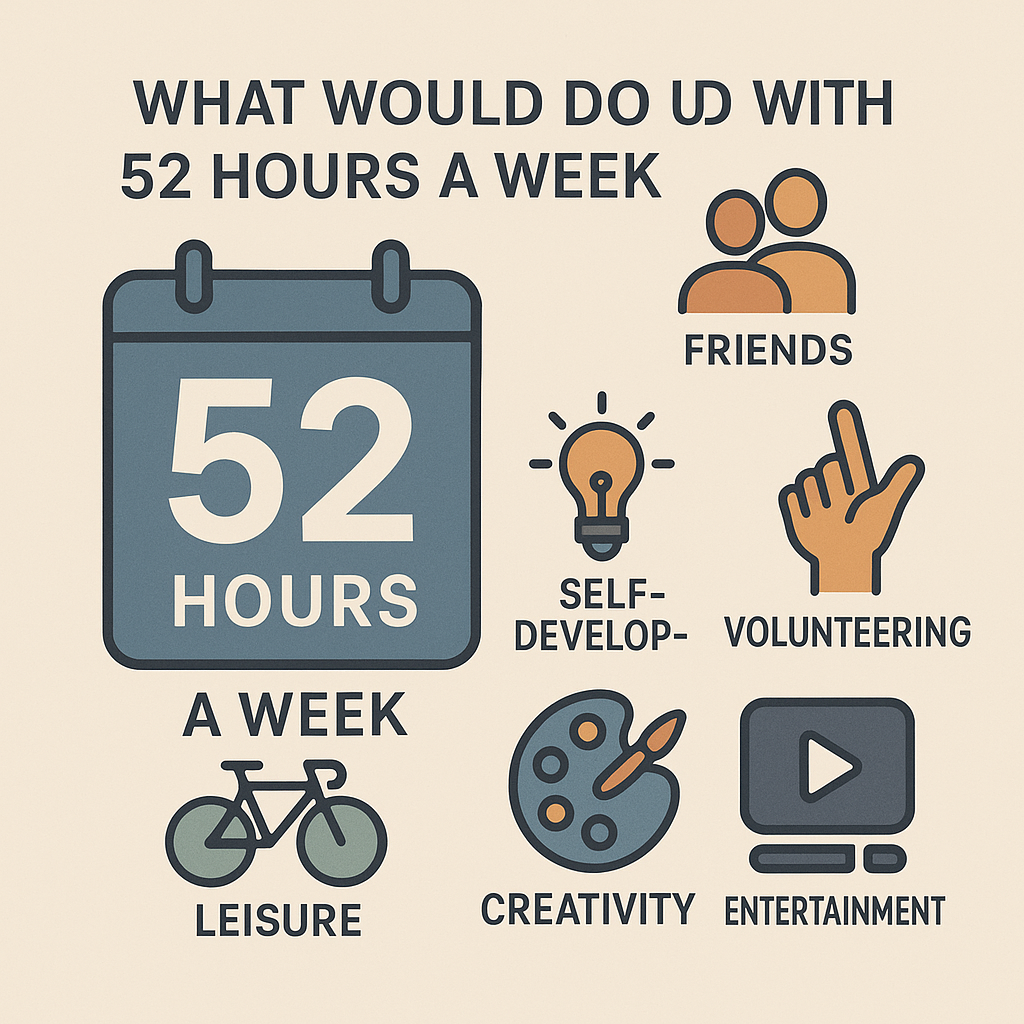 Натан Браун в своём блоге What would you do with 52 hours a week of discretionary time? напоминает о простой, но часто игнорируемой истине: даже при стандартном графике «работа–еда–дорога–сон» у нас остаётся около 52 часов свободного времени в неделю. А если учесть дополнительные мелочи вроде стирки и походов в магазин — всё равно остаётся порядка 38 часов. Это почти целая рабочая неделя, но которую мы можем прожить так, как захотим. Если разбить неделю на блоки: В итоге остаётся: В сумме выходит те самые 3160 минут ≈ 52,7 часа. Я часто слышу жалобы: «нет времени на саморазвитие», «не хватает суток», «всё уходит на рутину». Но если взглянуть на эти цифры, становится очевидно — проблема не в отсутствии времени, а в том, куда мы его тратим. И вот здесь вступает главный тезис Брауна: быть осознанным в использовании свободных часов. Я считаю, что ценность этой идеи — в «перевороте оптики». Мы привыкли думать о времени как о дефиците, но если пересчитать, то оказывается, что «лишние» часы у