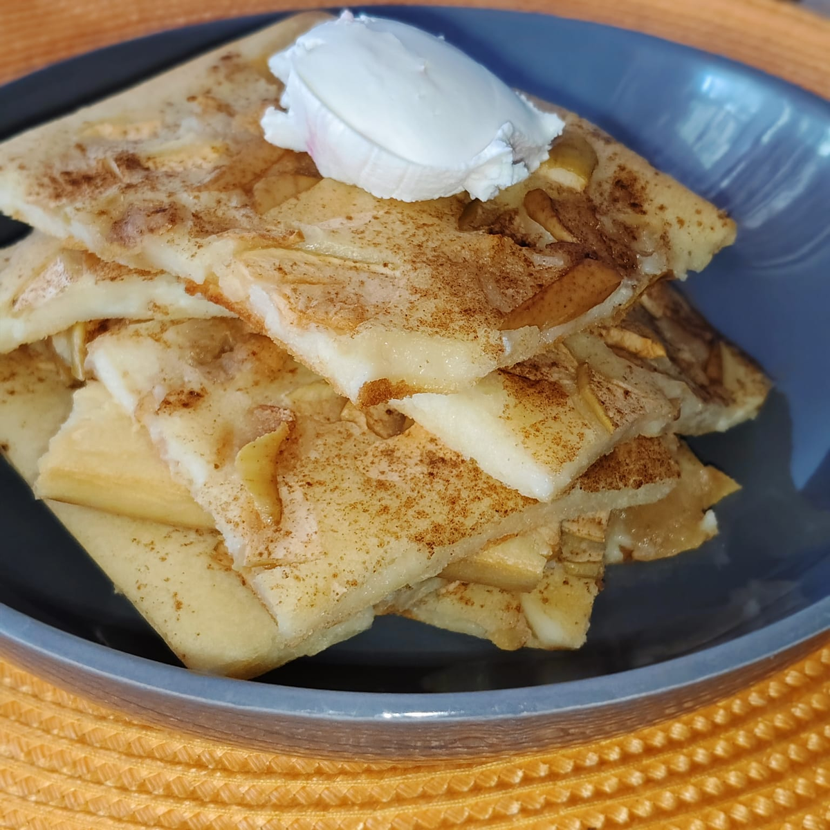 Масло -- 1 ст.ложка, топлёное растопленное или оливковое для жарки, о нём писала здесь Яблоко и груша - по одному небольшому плоду Яйцо взбить с молоком, стевией и солью. Добавить муку. Тоже взбить до однородного состояния без комочков. Я чуть больше добавила муки. Тесто жидкое, блинное. Выливаем его на коврик с бортиками. Я его не смазывала, как и все силиконовые формы. *подробнее о коврике по ссылке Поверхность - как чистый лист, так и просится что-нибудь добавить и чем-нибудь присыпать ) Что я и сделала ) В первый раз блин в готовом виде разрезала и завернула рулетиками, люблю это дело ) А в этот раз сворачивать не буду, поэтому яблок