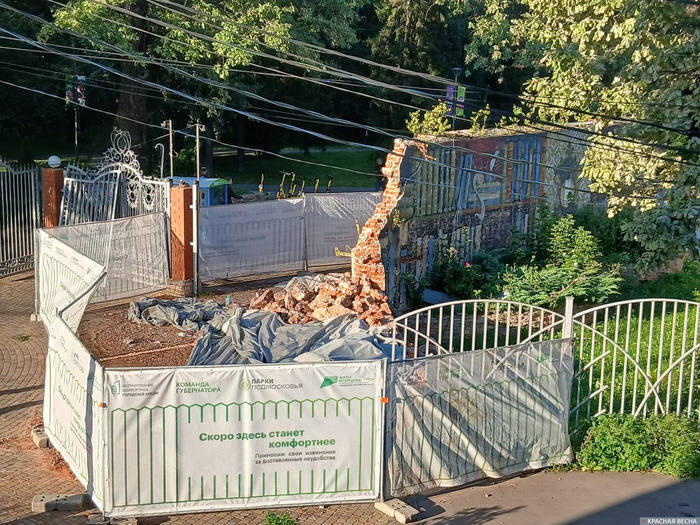 В рамках реконструкции парка культуры и отдыха имени Толстого в подмосковных Химках строители начали сносить историческое панно с мозаикой, эскиз которого создал заслуженный художник России Николай Закрытный. На панно изображены музыкальные инструменты. После возведения на открытие панно приезжал посмотреть Владимир Высоцкий. Стену огородили стендом с надписью «Скоро здесь станет комфортнее. Приносим свои извинения за доставленные неудобства». Надпись очень символичная, поскольку часто, преследуя некий комфорт, оказывается под ударом история города. Местные жители стали массово звонить в администрацию округа и полицию, как только заметили, что идет снос. Когда правоохранители приехали на место, строители остановили работу и сбежали. Но от стены практически ничего не осталось. «Реву. Сразу понятно, что это одобрили и сделали те, кто не рос в Химках. Каждый химкинский ребенок эту стенку знает с детства. Жалко до слез», — возмущена жительница. Другой житель предположил, что это делалось р