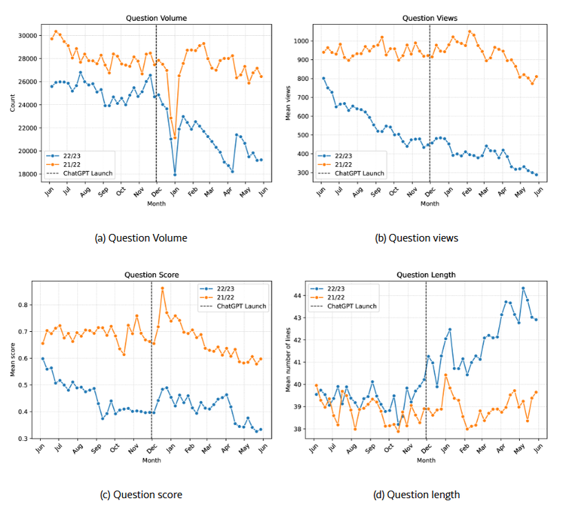 Помните, не так давно я и сам писал пост о падении популярности Stack Overflow? Все графики падали, трафик летел в пропасть, казалось, эпоха ушла. Зачем страдать с токсичными модераторами, если можно вежливо спросить у нейронки, которая, к тому же, на данных самого SO и обучалась. Ну так вот. Похоже, это ошибка и все смотрели не туда. Тут появилось академическое исследование, которое вскрыло крайне любопытную картину того, что на самом деле происходит с SO после пришествия ChatGPT. Да, количество вопросов действительно рухнуло. Это неоспоримый факт. Народ массово понес свои простые запросы нейронке, которая вежливо и без лишних предисловий объясняет, как «отсортировать список в Python». Но самое интересное началось, когда исследователи копнули глубже и посмотрели не на количество, а на качество и суть того, что осталось. И вот тут-то всё встало с ног на голову 🤯 Оказывается, пока мы хоронили платформу, она тихо мутировала во что-то совершенно иное. По сути, ChatGPT не убил Stack Overf