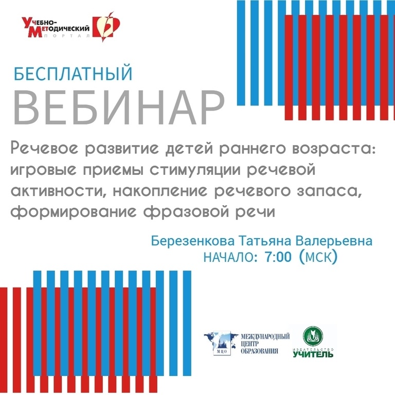 Вебинар «Речевое развитие детей раннего возраста: игровые приемы стимуляции речевой активности, накопление речевого запаса, формирование фразовой речи» Дата проведения: 12.09.2025 Начало: 7:00 (МСК) https://www.uchmet.ru/events/item/3907366/ На вебинаре слушатели познакомятся с эффективными приёмами, позволяющими развивать и совершенствовать понимание речи, формировать собственное речевое произношение и активный словарь у детей раннего дошкольного возраста. Содержательные вопросы вебинара: 1. Психоречевое развитие детей раннего возраста. 2. Формирование потребности в общении. 3. Игры на развитие подвижности артикуляционного аппарата. 4. Упражнения на развитие фонематического восприятия. 5. Развитие речевого дыхания. 6. Игровые приемы формирования лексико-грамматических категорий. 7. Пальчиковая гимнастика в формировании речевых навыков. 8. Фразовый конструктор в речевом развитии детей раннего возраста: примерные модели, приемы использования. 9. Создание условий для стимулирования ре
