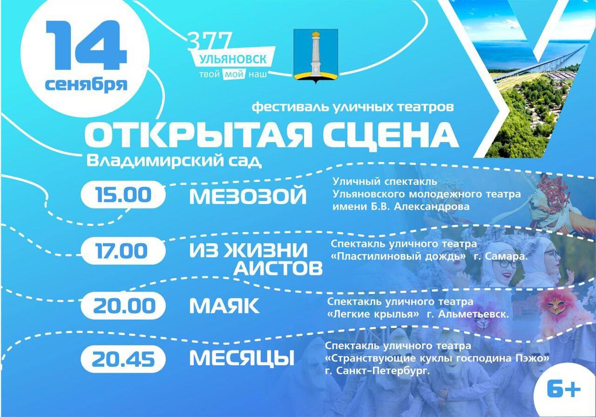 Фестиваль уличных театров 🎭 📅 14 сентября с 15:00 до 20:30 📍парк «Владимирский сад» В программе спектакли под открытым небом от ведущих уличных театров России: ▪️15:00 | Ульяновский молодежный театр представит «Мезозой» – портал в доисторическую эпоху с гигантскими динозаврами и древними обитателями. ▪️17:00 | «Пластилиновый дождь» из Самары покажет «Из жизни аистов» – завораживающую поэтическую фантазию о жизни величественных птиц, рассказанную без слов. ▪️20:00 | «Легкие крылья» из Альметьевска представят «Маяк» – морскую сказку о крошечных морячках-маячках, хранителях света и любви. ▪️20:45 | Петербургский театр «Странствующие куклы господина Пежо» пригласит вас в «Месяцы» – причудливую одиссею по лабиринтам подсознания, сотканную из масок и костюмов. 🏷️ вход на все спектакли свободный #14сентября25