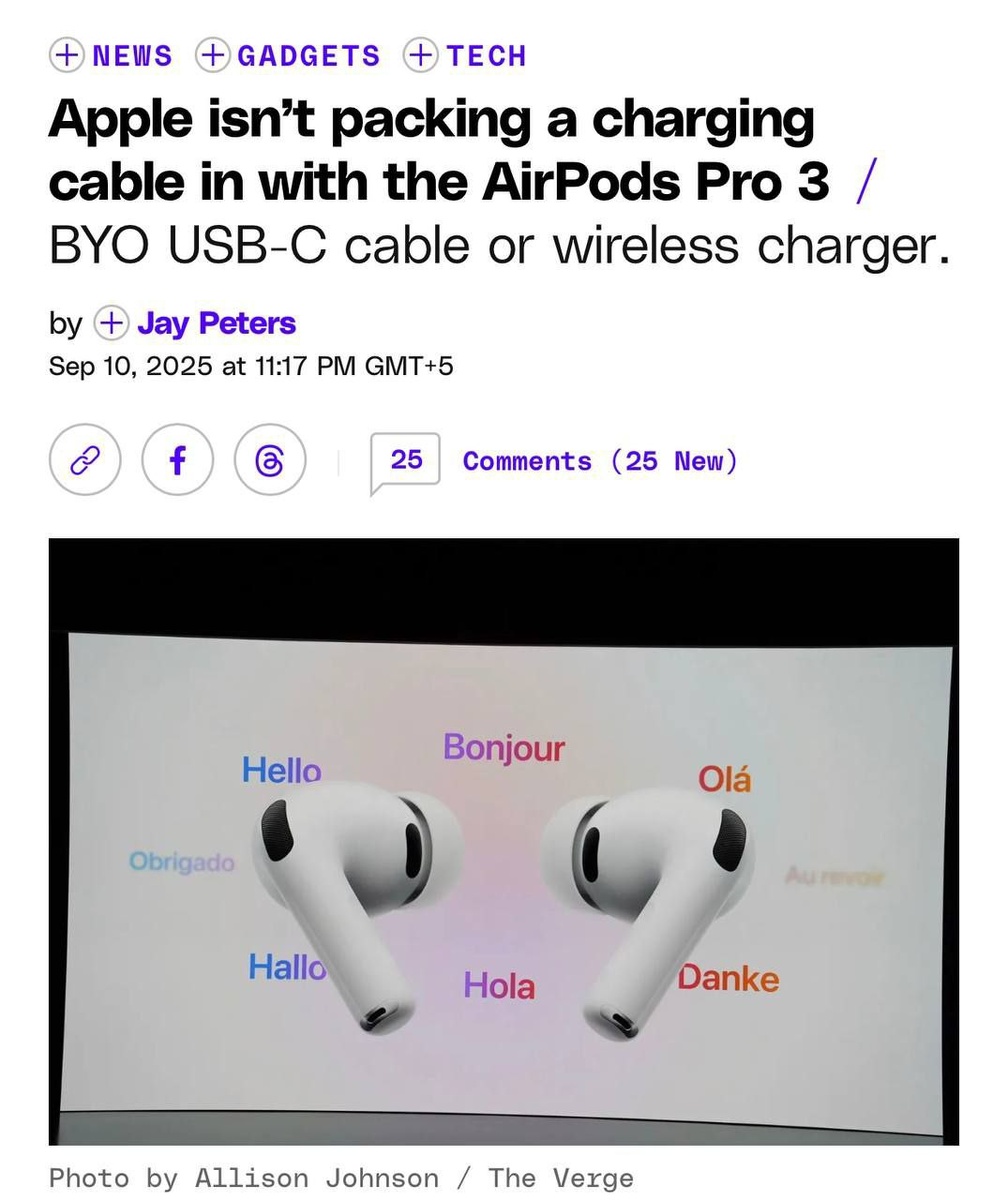 AirPods Pro 3 выйдут БЕЗ КАБЕЛЯ в комлекте — USB-C шнур для зарядки придётся покупать отдельно примерно за 1,5 тысячи рублей. Адаптера питания в коробке тоже не будет, но это не новость: его убрали ещё при выходе первых AirPods Pro в 2019 году. По-настоящему беспроводные наушники.