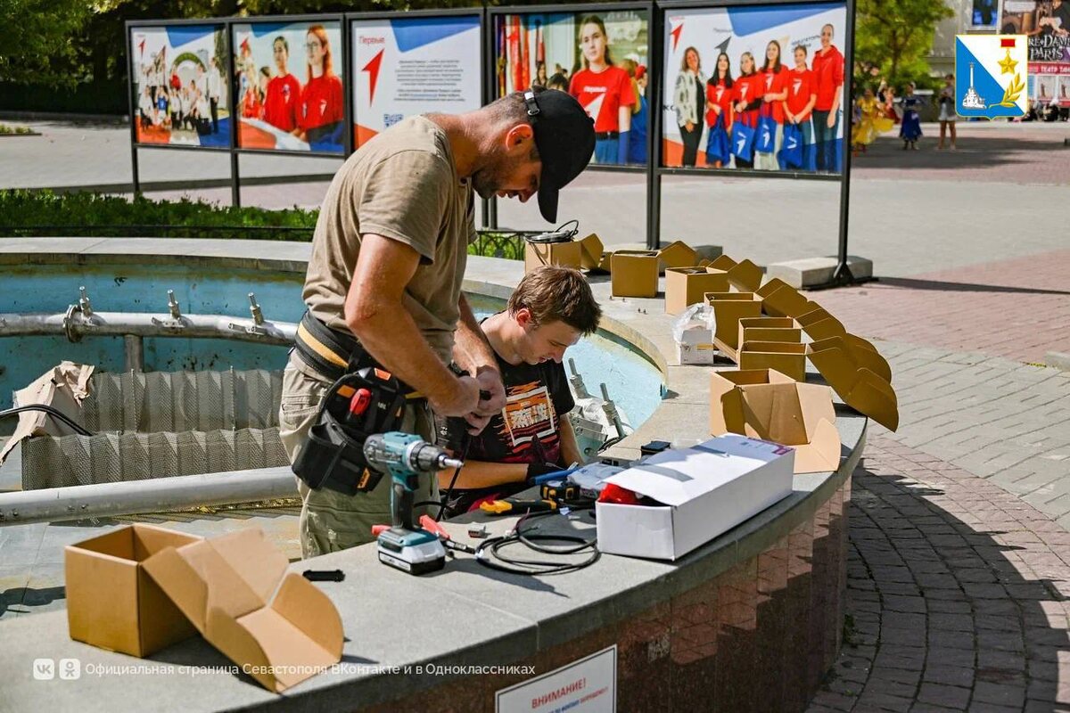 В фонтане напротив Дворца детского и юношеского творчества специалисты устанавливают систему подсветки из 39 светильников, (36 — по кругу, а 3 — в центре).