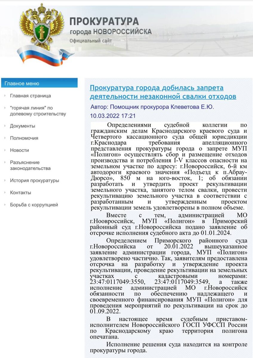 «На сегодняшний день администрация муниципального образования город-герой Новороссийск ведёт активную работу по включению объекта «Рекультивация (консервация) свалки ТКО по адресу: Краснодарский край, 6-й км автодороги «Подъезд к п. Абрау-Дюрсо» в Глебовском сельском округе» в государственную программу «Чистая страна» и в единый ГРОНВОС (Государственный реестр объектов накопленного вреда окружающей среде). Чтобы свалка получила финансирование на рекультивацию из федерального бюджета, она должна быть официально внесена в этот специальный реестр и программу «Чистая страна».