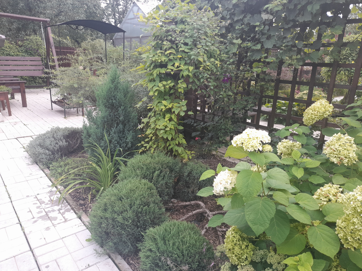 К хвойным я всегда относилась с осторожностью. Стоят дорого, растут медленно, болеют, ломаются ледяными дождями, обгорают весной. Но ранней весной и поздней осенью они очень украшают сад. Поэтому хвойные растения есть и у меня в саду. Дорогие и крупные экземпляры я не покупала, но кое-что показать могу. На участке до перехода его в нашу собственность росли два больших казацких можжевельника. Один мы оставили на месте в цветнике у входа, а второй перенесли в большой цветник у пруда. Можжевельники эти очень быстро увеличивались в размере, в их зарослях очень хорошо себя чувствовали сорняки. Прополоть все это колючее хозяйство было очень сложно и мы решили сделать им Ниваки. Оголили стволы, а концы сформировали в виде шариков. У одного эти шарики четкие, а у второго смыкаются и выглядят как крылья. Стволы подняли на металлические рогатки. Теперь они не касаются земли, а значит не укореняются и защищены от разлома во время ледяных дождей и сильных снегопадов. Нам такая форма нравится, сохр