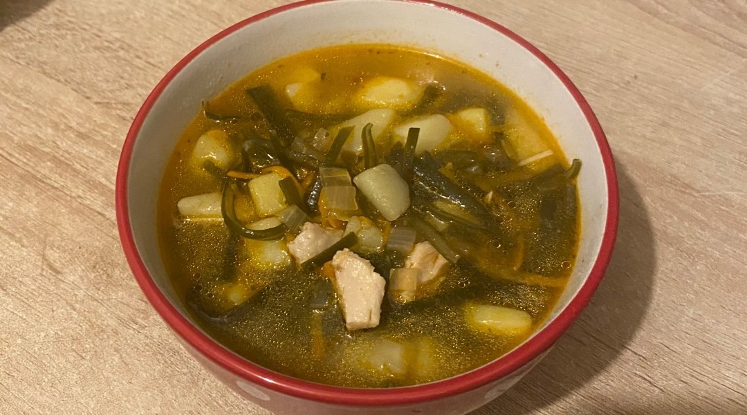 Самый полезный суп от жителей г. Владивостока. Приготовление: 1. Отварить бульон. Довести бульон до кипения, после убавить огонь на минимум, варить час, постоянно убирая пену. 2. Добавить в бульон мелко нарезанный кубиком картофель. 3. Лук и морковь обжарить на сливочном масле до готовности. 4. Добавить в бульон обжаренные овощи и морскую капусту, предварительно слив из нее лишнюю жидкость. Важно добавлять морскую капусту после того, как приготовится картофель. Морскую капусту беру консервированную в жестяной банке, она так и называется "Салат из морской капусты - Дальневосточный". 5. Яйцо взболтать и влить тонкой струйкой в суп. Добавить специи. Варить 15 минут на небольшом огне. По желанию яйцо можно отварить и порезать в суп, как вам больше нравится. По желанию можно добавить зелень. Подавать со сметаной. Ингридиенты: 1. Курица для бульона (любые части) 🐔 2. Картофель (4 штуки) 🥔 3. Лук репчатый (1 головка) 🧅 4. Морковь (1 штука) 🥕 5. Яйцо (1 штука) 🥚 6. Консервированная м