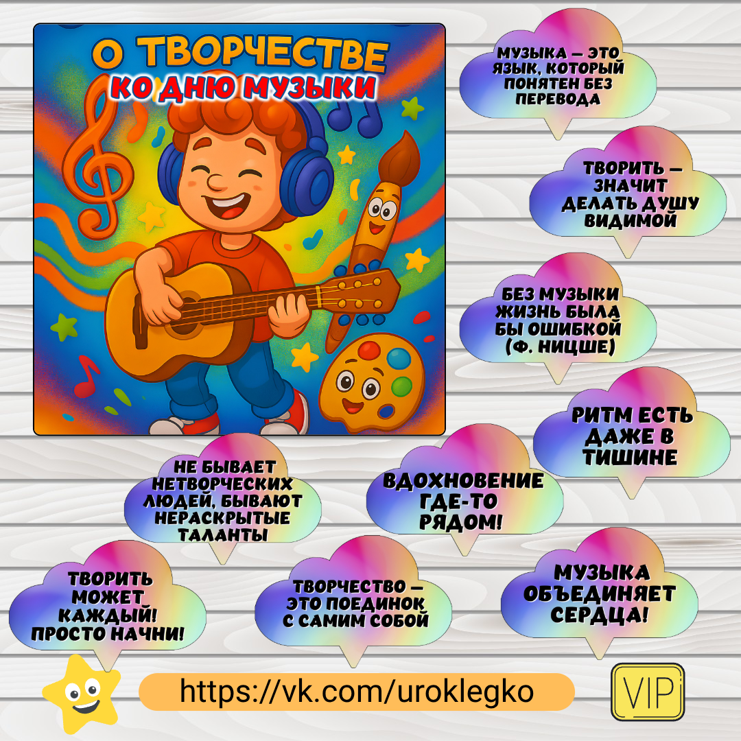 Данный набор для оформления школы ко Дню музыки необходим для того, чтобы создать яркую и содержательную праздничную атмосферу, визуально подчеркнуть значимость музыки и творчества в жизни человека. Плакат (доступный как в крупном формате для актового зала или фойе, так и в виде сборной версии для классного уголка) служит центральным смысловым и декоративным элементом, привлекающим внимание. Девять тематических фраз на отдельных листах А4 выполняют роль лаконичных и вдохновляющих цитат, которые можно разместить на стендах, дверях или окнах для раскрытия темы с разных сторон — они расскажут о силе и красоте музыки, обогатят пространство и станут поводом для размышления и дискуссии среди учеников и педагогов. Где можно скачать: https://vk.com/uroklegko