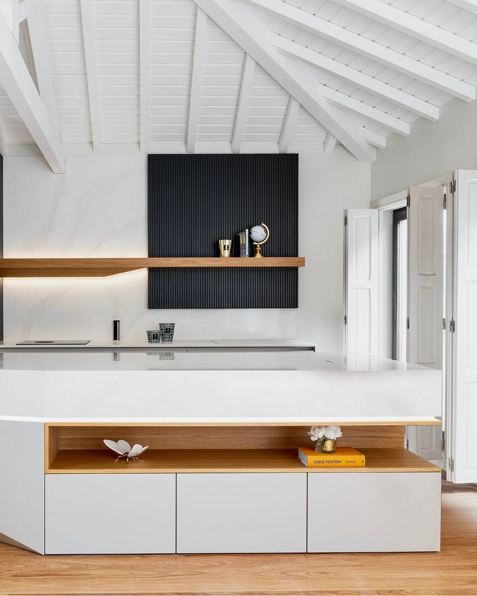 Этот эффектный кухонный остров из кварцевого камня Silestone Eternal Calacatta Gold — это больше, чем просто красивый фасад. Здесь смелый дизайн сочетается с продуманной функциональностью: представьте себе встроенные розетки, встроенную мойку на заказ и облицовку стены, которая струится элегантно и функционально. Прожилки как у натурального мрамора добавляют нотку роскоши, а обработанная поверхность облегчает повседневную жизнь: она долговечна, не требует особого ухода и изготовлена с учетом принципов устойчивого развития. Больше информации вы найдёте на нашем официальном сайте.