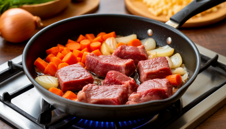Традиционно нам советуют начинать с лука. Обжарить его до золотистого цвета, чтобы он отдал маслу свой аромат, а затем добавлять морковку и мясо. Другие утверждают, что мясо — чтобы «запечатать» соки внутри и получить румяную корочку.