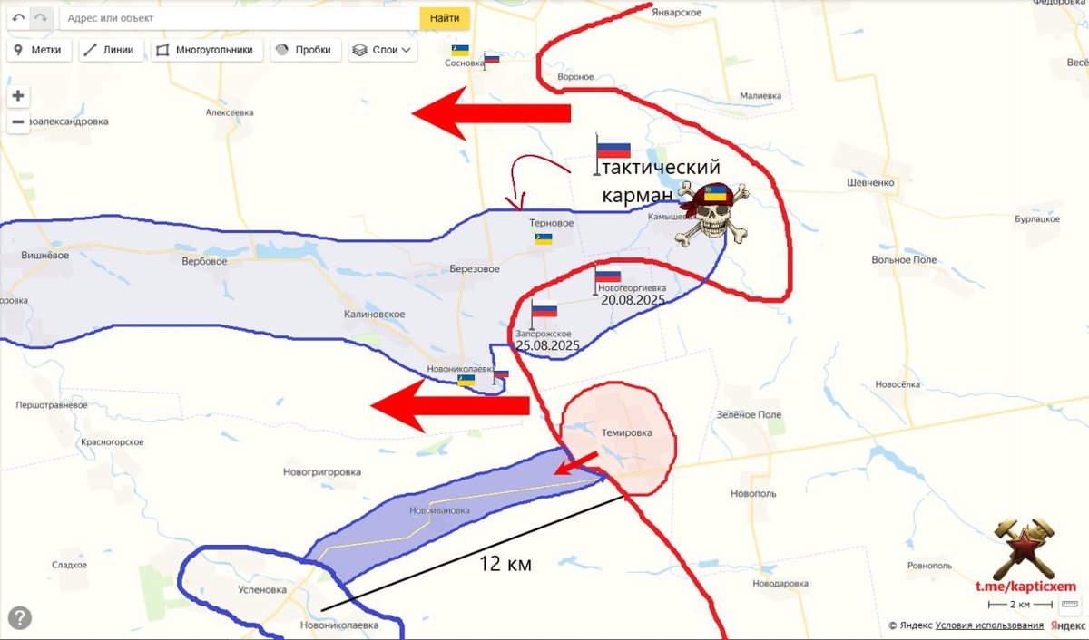 И в центре идет маневр охвата, уже в самой полосе обороны, укрепленного н.п.Терновое. Примерно так же брали рубеж от Курахово до Богатыря и ряд других.