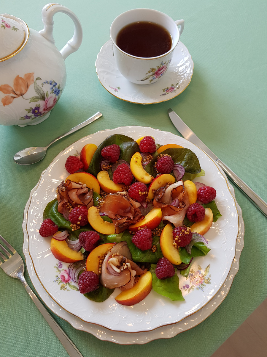 Добрый день, дорогие друзья! Сегодня я представляю вашему вниманию салат, который придаст летнее настроение вашему обеду или ужину, даже в морозный день. Для приготовления 4 порций нам понадобятся: 100 грамм листьев салата ромен, 500 грамм нектарина, 500 грамм малины, 80 грамм прошутто, 40 грамм красного ялтинского лука, 1 столовая ложка оливкового масла, 1 чайная ложка бальзамического уксуса, 1 чайная ложка зерновой горчицы. Приготовление: листья салата промыть, обсушить, разрезать и разложить по тарелкам. Прошутто свернуть в виде розочек и разложить по тарелкам на листья салата. Нарезать перьями красный лук и добавить его в тарелки с салатом. Нарезать дольками нектарины и выложить их на листья салата. Разложить малину по тарелкам. Смешать заправку из оливкового масла, уксуса и зерновой горчицы. Полить заправкой салат. Приятного аппетита!