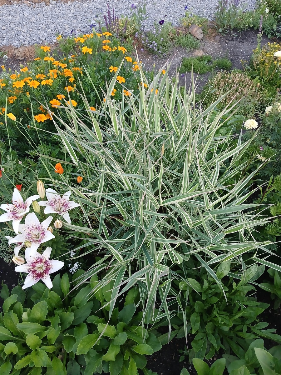 Злак, который часто можно увидеть в городских палисадниках - в одном из ближайших ко мне я его и достала, немного подкопнув пару стебельков с корешком. И единственный злак, который у меня есть на данный момент. Триколор, потому что на ярком солнце его белые полосочки частично розовеют. Формирует симпатичную подушку и хорошо разрастается корневищем - нужно контролировать, потому что без контроля он может заполнить большую территорию, а это уже совсем не так симпатично. Лучше всего выглядит в качестве одного из равноценных по габитусу обитателей цветника (мой вариант на данный момент), или как часть миксбордера. Выгодно выделяется на фоне сплошной зелени, когда цветов ещё нет. На фото - фалярис 5 июля по соседству с цветущими лилиями, эшшольцией, шалфеем, бархатцами, а также кореопсисом, колокольчиками и астрами, которые на тот момент ещё не зацвели.