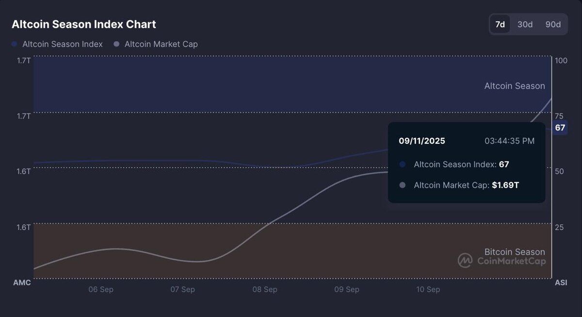 🔸Индекс сезона альткоинов резко вырос до 67 с 29 в прошлом месяце, что указывает на усиление импульса альткоинов