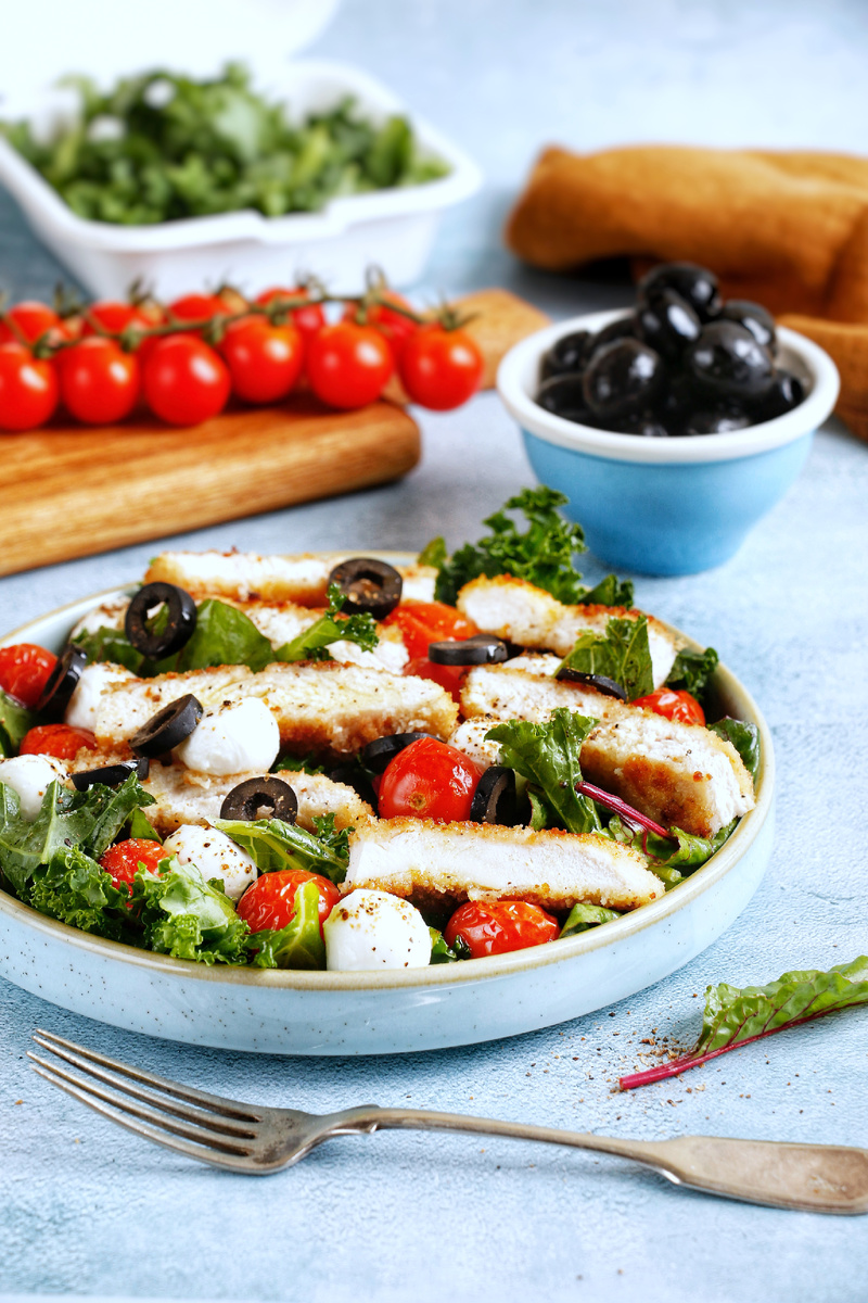 С наступлением холодов организм нуждается в дополнительной энергии, поэтому повышается аппетит и желание употреблять более калорийную и согревающую пищу, такую как супы, мясо, рыба и орехи, которые помогают улучшить настроение🙃 Представляю вашему вниманию теплый салат со шницелем🔥 Этот легкий салат особенно понравится тем, кто следит за фигурой👌🏼 Свежие салатные листья, нежная моцарелла, сочные томаты, хрустящая курочка🤤 Идеально, для сытного, полезного, красочного обеда! Теплый салат со шницелем. Ингредиенты: •Микс салат 100 гр. •Моцарелла мини 100 гр. •Томаты черри 100 гр. •Маслины 7-8 шт. 🔸Для шницеля: •Яйцо куриное 1 шт. •Панировочные сухари 50 гр. •Куриная грудка 1 шт. •Соль/специи по вкусу. •Масло растительное для жарки. Приготовление: 🔸 Томаты черри: •Томаты хорошо промываем, выкладываем в жаропрочную форму и отправляем в разогретую до 200 градусов духовку на 10-15 минут. Они должны слегка потрескаться. Готовые томаты остужаем. 🔸Готовим шницель: •Куриную грудку аккурат