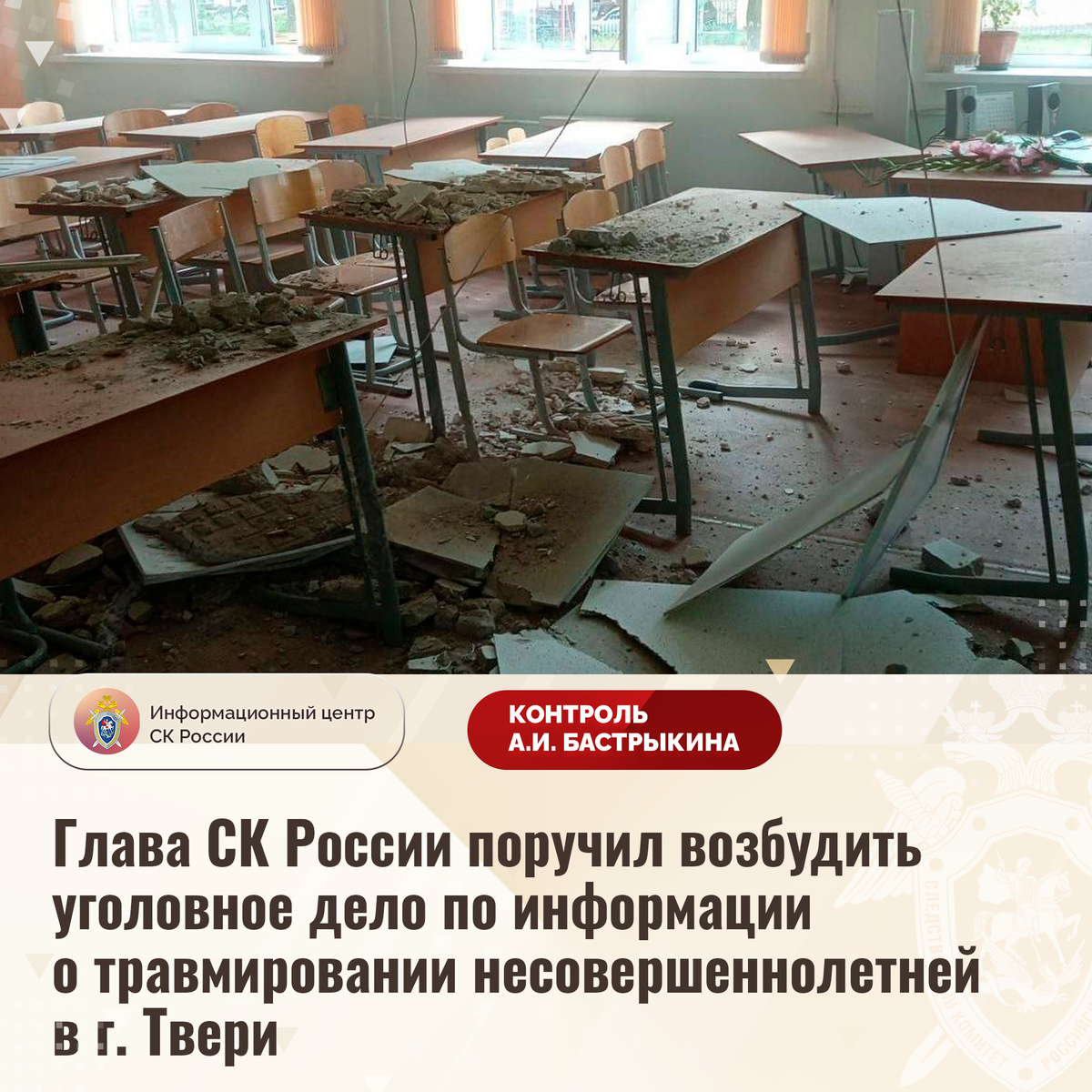 Глава СК России поручил возбудить уголовное дело по информации о травмировании несовершеннолетней в г. Твери В телеграм-канале сообщается, что в сентябре текущего года в кабинете одного из образовательных учреждений города Твери во время занятия произошло обрушение потолочных перекрытий, в результате чего пострадала ученица восьмого класса. Отмечается, что мер к оказанию девочке медицинской помощи не принято. В СУ СК России по Тверской области по данному факту организована процессуальная проверка. Председатель Следственного комитета Российской Федерации Александр Иванович Бастрыкин поручил руководителю СУ СК России по Тверской области Альберту Андреевичу Кизимову возбудить уголовное дело и представить доклад о предварительных и окончательных результатах его расследования. Исполнение поручения поставлено на контроль в центральном аппарате ведомства. #СледственныйКомитет #СКРоссии #СКР #ИЦСКР #Информационныйцентр #АлександрБастрыкин #ПредседательСКР #КонтрольПредседателяСКР #КомментарийК