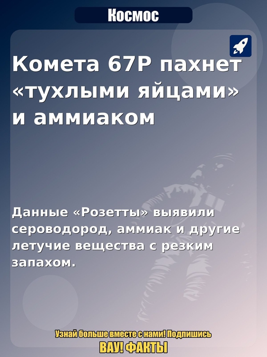 Комета 67P пахнет «тухлыми яйцами» и аммиаком. Данные «Розетты» выявили сероводород, аммиак и другие летучие вещества с резким запахом. Интересный факт по теме «Космос»: Комета 67P пахнет «тухлыми яйцами» и аммиаком. Почему так: Данные «Розетты» выявили сероводород, аммиак и другие летучие вещества с резким запахом.. Поделитесь в комментариях, знали ли вы об этом и стоит ли делать продолжение по теме. #космос #факты #астрономия