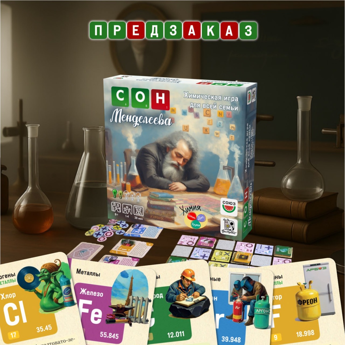 У вас еще есть возможность предзаказать отличную и полезную настольную игру по общей Химии «Сон Менделеева