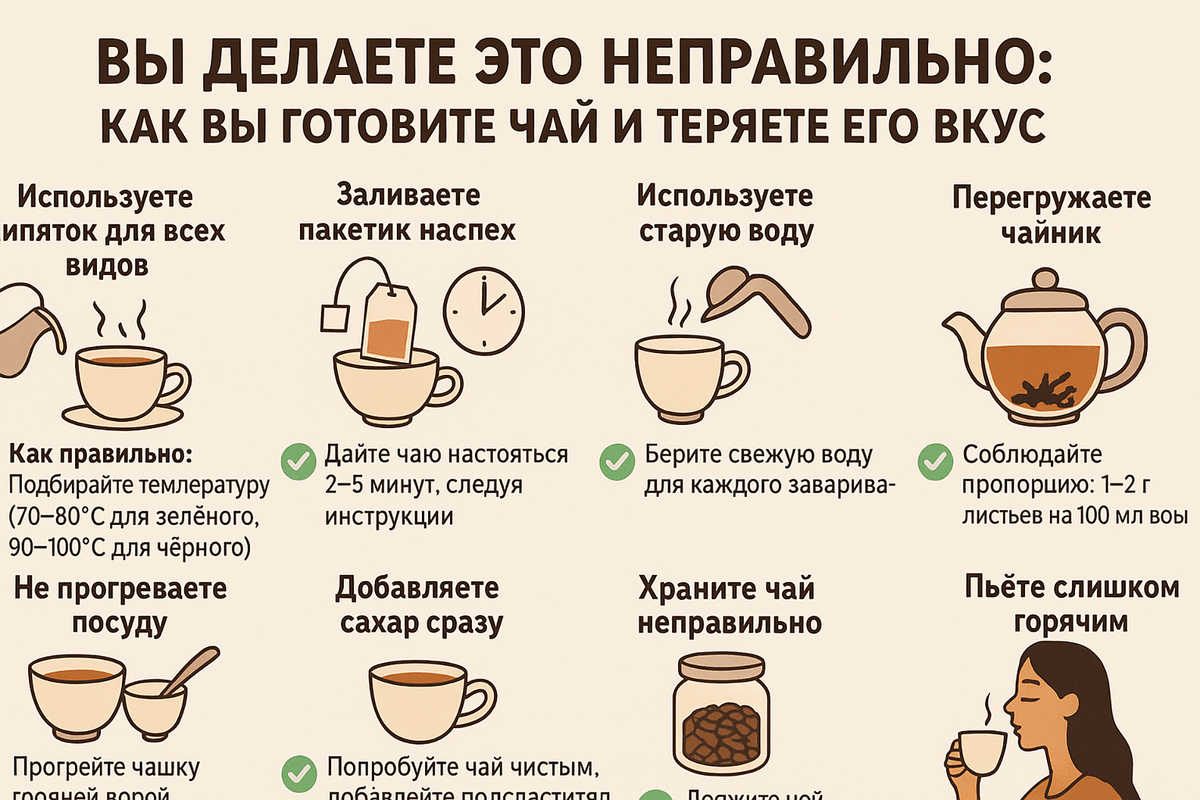 ✅ Как правильно: Дайте чаю настояться 2–5 минут, следуя инструкции. Повторно кипячёная вода теряет кислород и вкус.