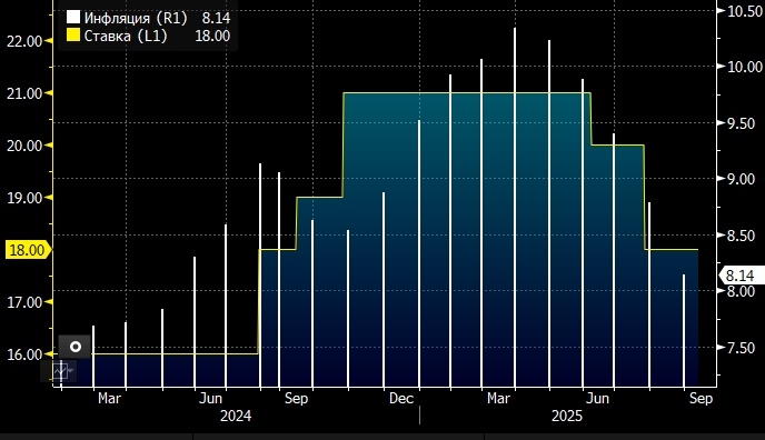 Снижение ставки ЦБ РФ на 200 б.п. в сентябре - наиболее вероятный вариант - "Астра Управление активами" Снижение ключевой ставки Банка России на 200 базисных пунктов (б.п.) по итогам заседания в пятницу, 12 сентября 2025 года, по-прежнему представляется наиболее вероятным вариантом, считает директор по инвестициям компании "Астра Управление активами" Дмитрий Полевой. "Инфляция за август сложилась вновь лучше прогнозов и недельных данных, в том числе из-за изменения сезонности в авиаперелетах. Но базовая инфляция также уверенно снижается, а общая динамика цен складывается лучше нижней границей прогноза ЦБ в годовом и сезонно скорректированном выражении. Из-за отсутствующих в недельном мониторинге авиаперелетов оперативные данные могут давать завышенную картину и в сентябре, хотя качественная картина к 8 сентябре немного ухудшилась, - отмечает эксперт в комментарии. - С учетом продолжающегося фактического охлаждения деловой активности и улучшения ценовых компонент в мониторинге компаний