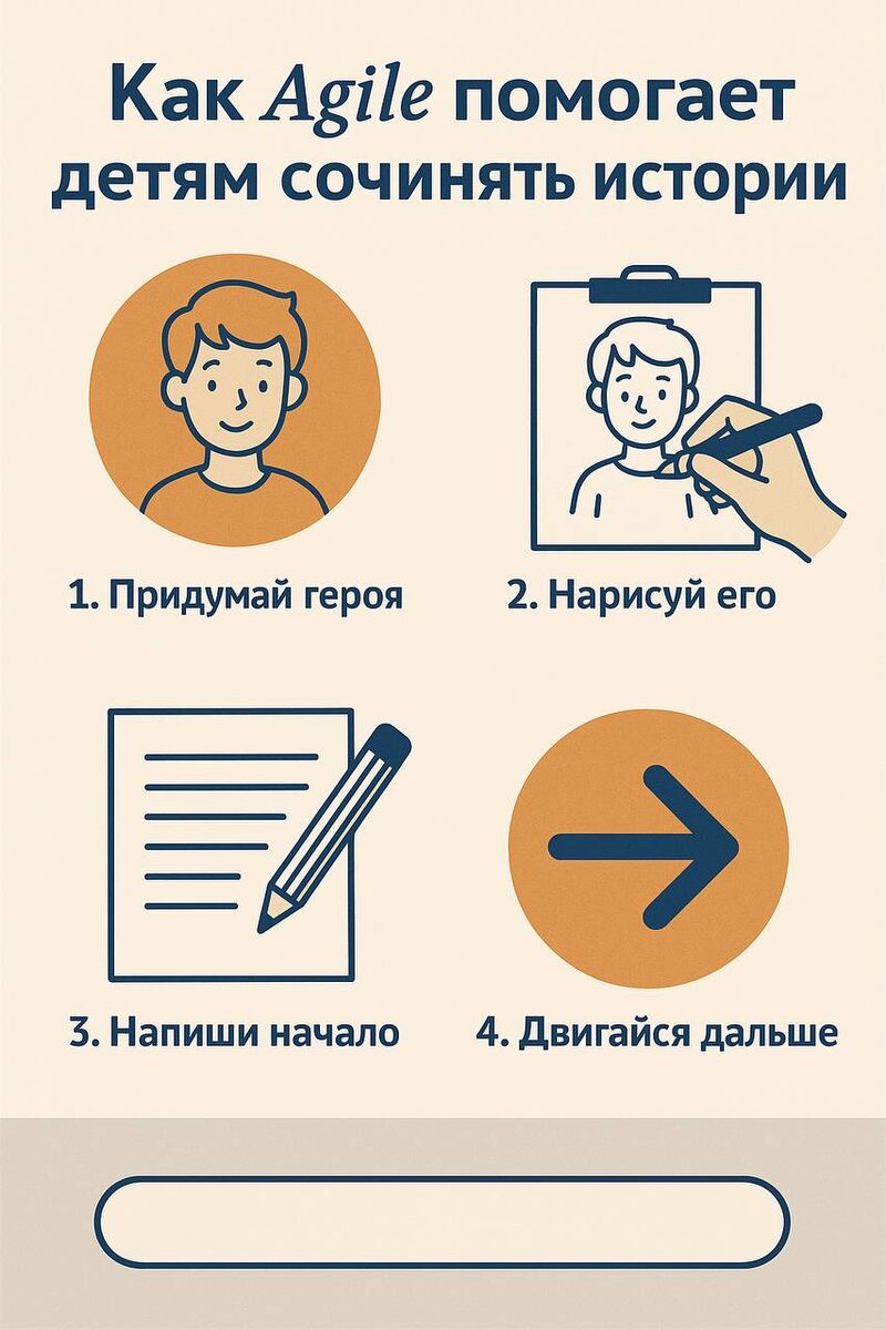 Когда дети начинают сочинять истории, они часто боятся: «А вдруг получится плохо? А вдруг я запутаюсь?» Но если применить Agile, страх исчезает. Ведь можно: