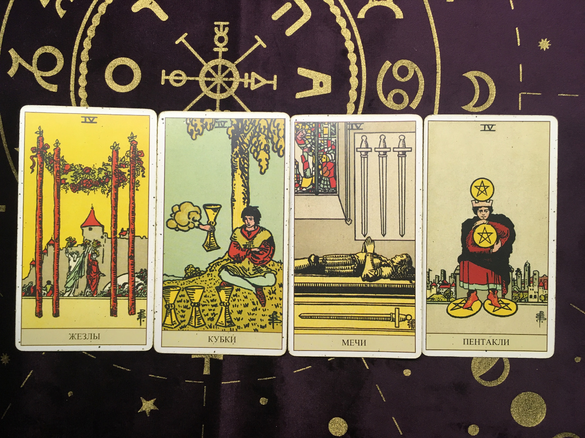 Если Тройка — это бурный рост и первые результаты, то Четверка — это момент, когда мы останавливаемся, чтобы закрепить достигнутое. Это число стабильности, порядка, фундамента и иногда — застоя. Энергия масти обретает прочную форму, структурируется и находит свое надежное место в мире.