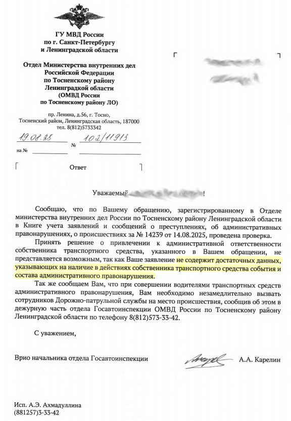 Инцидент зафиксирован в г. Тосно Ленинградской области, 13.08.2025 в 21: 40 по местному времени. На мосту через железную дорогу по шоссе Барыбина (41А-003) в направлении станции Зареченская, автомобиль нарушителя на середине моста выполнил обгон, с выездом на встречную полосу через сплошную линию, с заметным превышением скорости. После чего через 200-300м - еще один обгон через сплошную, в добавок выполненный на перекрёстке с прилегающей дорогой (прямо возле заправки Балтпроект). Манёвры водитель совершал резко, агрессивно, явно создавая опасную аварийную ситуацию. Я решил проинформировать нарушителя, что недоволен его поведением на дороге, для чего дважды моргнул дальним светом. Не знаю на что я надеялся. Может быть, на то, что он перестанет шашковать... Можно было бы предположить, что у нарушителя чрезвычайная ситуация (едет в больницу или еще куда), но через 1-2км, он специально остановился на обочине, дождался меня, выехал позади меня, и начал моргать мне дальним светом, с целью "о