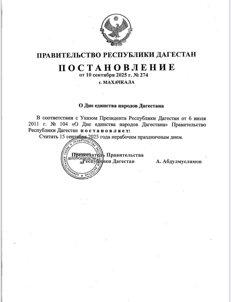 ⚡️Дагъыстанда 15-нчи сентябр ишлемейген гюн деп билдирилген. 15 сентябр байрам гюн - Дагъыстанны халкъларыны бирлигини гюню.