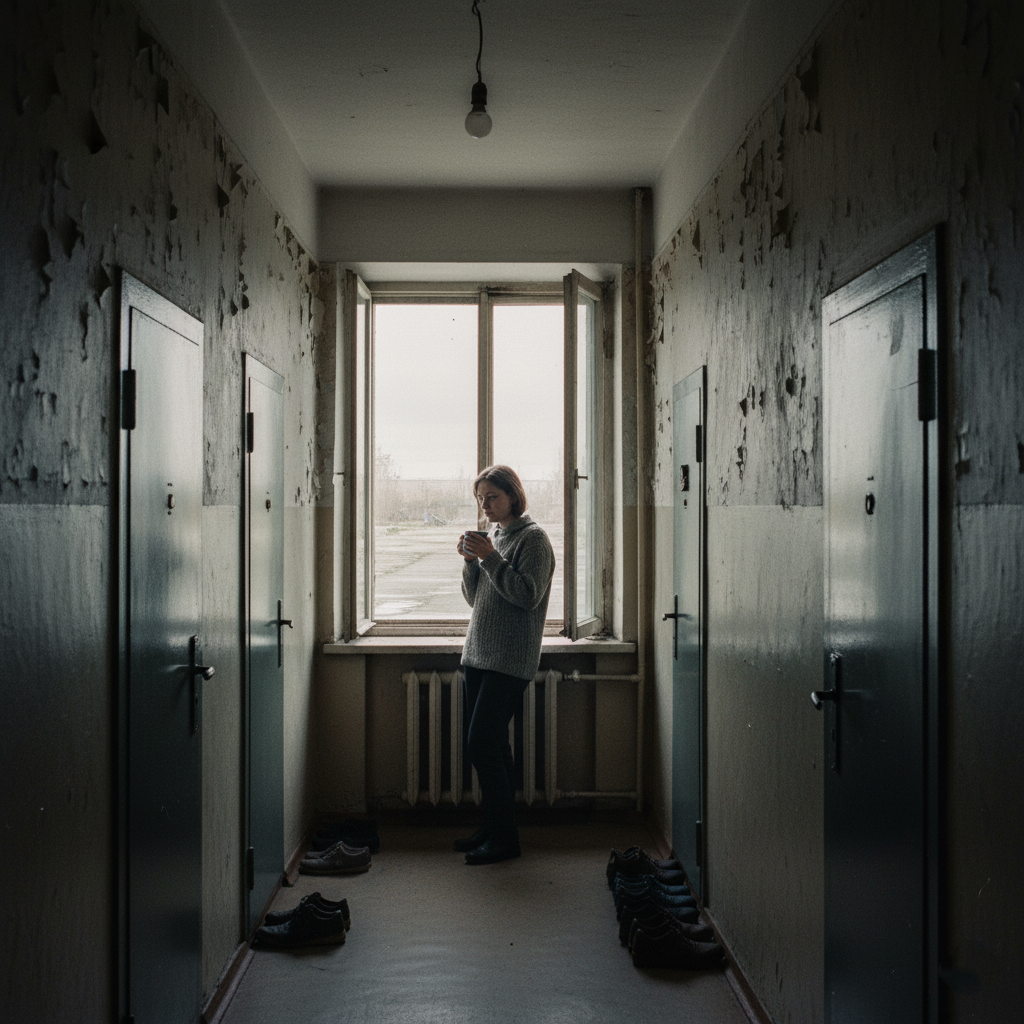 Мы жили в общежитии. Северные окна выходили на пустырь, где ветер ныл почти круглый год. В подъезде пахло мокрой фанерой и хлоркой, тараканы выползали вечером как по расписанию. Наша комната — двенадцать метров, железная кровать у мамы, раскладушка у меня, стол с пятном от утюга. За стенкой орал телевизор и кипела чужая жизнь.
