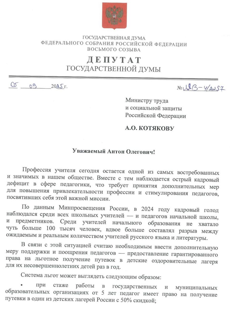 🚴♀️⚡Необходимо предоставлять ежегодные льготные путевки в лагеря для детей учителей 📩 Направила такое обращение главе Минтруда Антону Котякову. Система льгот может выглядеть так: 🟡при стаже работы в государственных и муниципальных образовательных организациях от 5 лет педагог имеет право на получение путевки в один из детских лагерей России с 50% скидкой; 🟡при стаже работы 10 лет и более путевка должна предоставляться бесплатно. ☀️ В перечень доступных лагерей могут быть включены «Артек», «Орленок», «Смена» и другие лучшие учреждения страны. В случае отсутствия у педагога несовершеннолетних детей льгота может распространяться на его внуков. Аналогичное право уже предусмотрено для дети участников СВО, детей-сирот. Некоторые регионы предоставляют путевки детям из многодетных семей и малообеспеченных. 👩🏫Реализация данной инициативы позволит повысить социальную защищенность педагогов, а также создать дополнительный стимул для их профессионального роста и долгосрочной работы