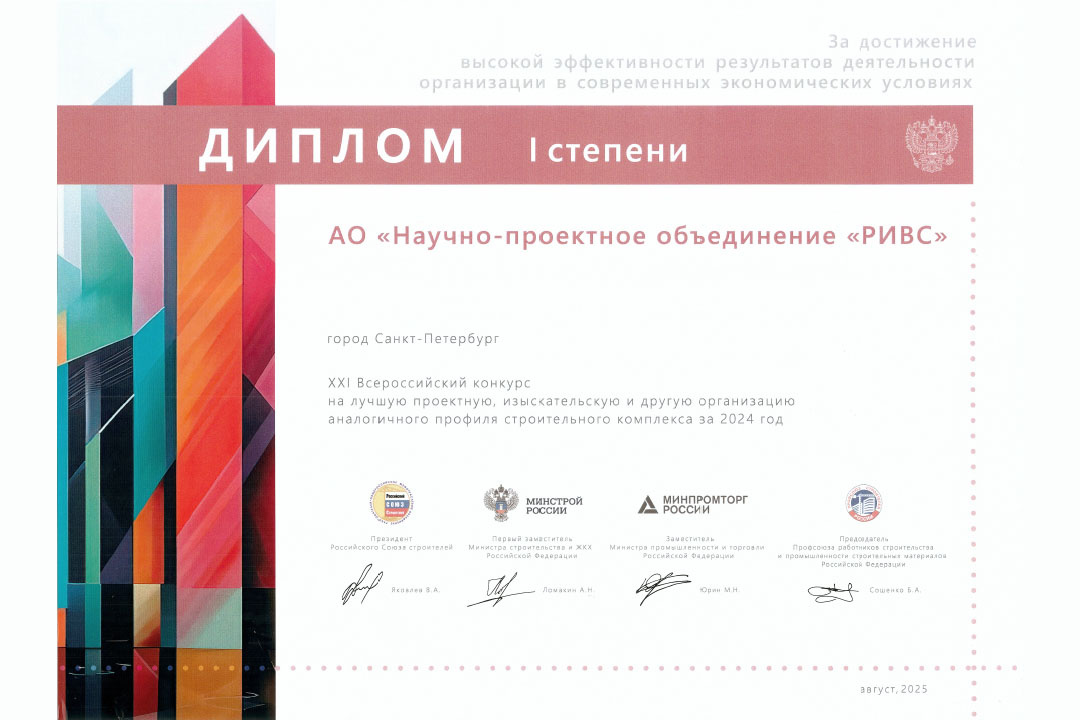 Компания «РИВС» стала лауреатом XXI Всероссийского конкурса на лучшую проектную, изыскательскую и другую организацию строительного комплекса по результатам 2024 года. По итогам конкурса «РИВС» был удостоен диплома I степени в номинации «За достижение высокой эффективности результатов деятельности организации в современных экономических условиях». Организаторами конкурса являются Российский Союз строителей, Минстрой России, Минпромторг России и Профсоюз строителей России. Цель конкурса — выявление наиболее эффективно работающих проектных, изыскательских и других организаций аналогичного профиля строительного комплекса, пропаганды и распространения передового опыта в сфере проектирования, изыскания. «Высокая оценка от ведущих отраслевых институтов России — лучшая характеристика для любой проектной организации, — подчеркнул генеральный директор «РИВС» Анатолий Хасянов. — Мы гордимся, что наш труд, наш подход к делу и наша эффективность получили столь весомое признание. Это общая победа вс