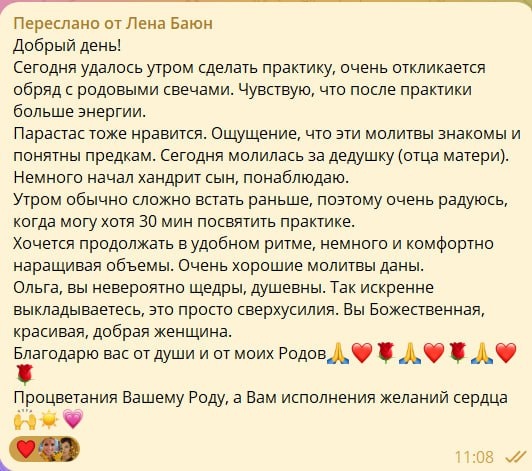 💛 😌☺️☺️☺️☺️ 💛 🤗 Мои хорошие! Сегодня получила вот такой отзыв о практиках, которые я даю в рамках интенсива «Сила Рода» ✨🔥. Каждый раз для меня это знак, что практики действительно работают глубоко и приносят благо Роду 🙏. И хочу напомнить: ещё можно присоединиться 🌟. Все материалы остаются у вас в доступе на целых 6 месяцев, чтобы вы могли проходить практики в своём ритме, возвращаться и проживать их глубже. Это возможность укрепить связь с Родом, получить поддержку предков и наполниться внутренней силой 💫. ПРИСОЕИНЯЙТЕСЬ! 🌳 Родовой интенсив "Сила Рода" (21 день углубленной работы с Родом в осенний период почитания предков Питри Пакша, 4 - 24 сентября) - https://t.me/olgavoroshirina/17242 Пишите мне, если остались вопросы 💌 — @makolya017