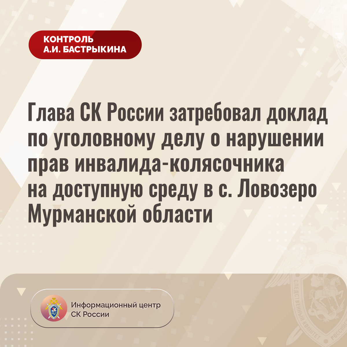 Глава СК России затребовал доклад по уголовному делу о нарушении прав инвалида-колясочника на доступную среду в с. Ловозеро Мурманской области В комментариях в социальной сети СК России размещено обращение по вопросу несогласия с ходом установления обстоятельств нарушения прав инвалида-колясочника из Мурманской области. Мужчина проживает на четвертом этаже многоквартирного дома по улице Ручьевой села Ловозеро, входная группа и подъезд которого не оборудованы пандусом. В прошлом году его жилое помещение признано непригодным для нужд инвалида. При этом для переселения ему предложена квартира на первом этаже в том же доме. В результате мужчина лишен возможности беспрепятственно покидать жилплощадь и посещать медицинские и социальные учреждения. Многочисленные обращения в различные инстанции результатов не принесли. До настоящего времени никто к ответственности не привлечен. Ранее А.И. Бастрыкин ставил указанную ситуацию на контроль в центральном аппарате ведомства. В СУ СК России по Мурма