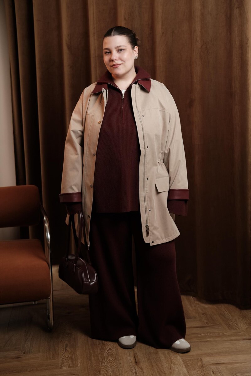 С чем носит новую куртку-ветровку дивный стилист Алина? Собираем образ, который согреет этой осенью — куртку-ветровку с трикотажным комплектом в насыщенном вишневом оттенке (идеально в тон вставкам из экокожи)