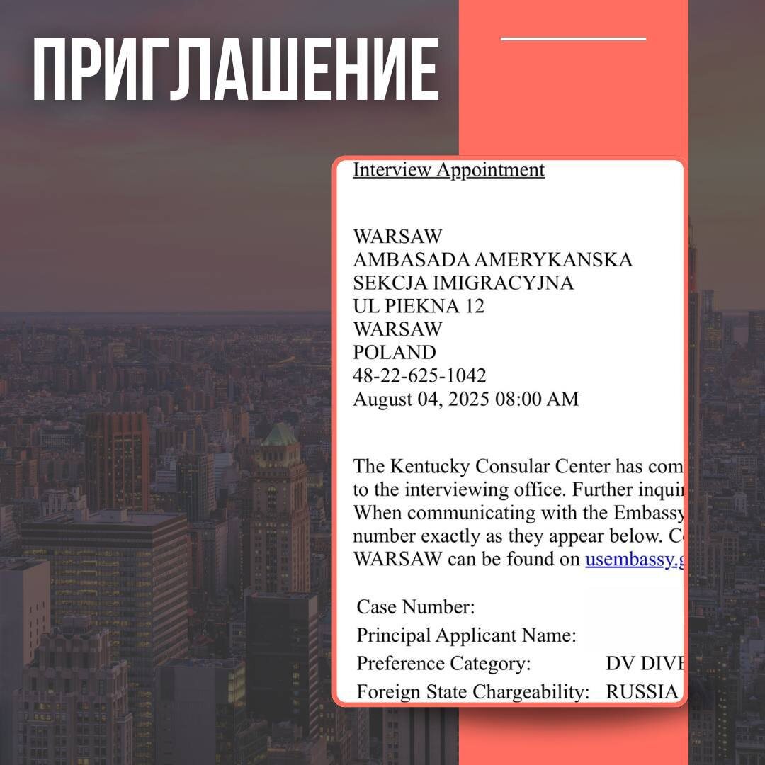 Продолжаем делиться историями победителей лотереи Green Card 🇺🇸 Помимо правильного заполнения заявки, ключевым этапом является оформление документов и успешное прохождение собеседования. Наш Клиент успешно прошёл собеседование на иммиграционную визу DV1 4 августа! Кейс: мужчина, не женат, проживает в Якутске, имеет высшее образование. Ранее в США Клиент не был. После выигрыша в лотерее Green Card собеседование на визу проходило в Варшаве (Польша). Для его посещения была оформлена шенгенская виза. Несмотря на последние новости и различные предрассудки, консульство в Варшаве продолжает одобрять визы США, и наш Клиент это успешно подтвердил. За последние 5 лет Клиент посетил 6 стран. Мы сопровождали его с сентября 2024 года, и почти год совместной работы привёл к этому отличному результату! Если вы тоже мечтаете изменить свою жизнь, рекомендуем ознакомиться с нашим постом «Почему с нами выигрывают Green Card». #кейс #Green_Card