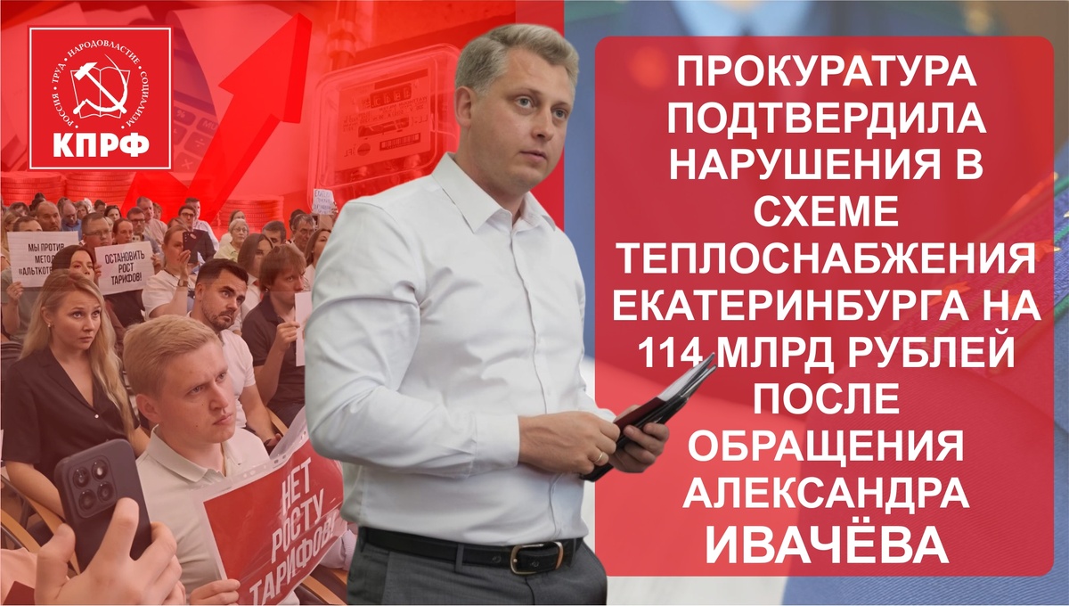Прокуратура Свердловской области подтвердила правоту Александра Ивачёва, кандидата в губернаторы от КПРФ, и признала серьёзные нарушения со стороны Администрации Екатеринбурга. Чиновники незаконно утвердили схему теплоснабжения города до 2045 года, которая приведёт к резкому повышению тарифов на тепло. Поводом для обращения стали грубейшие нарушения во время публичных слушаний 11 июня 2025 года по проекту схемы, предусматривающей инвестиции в частные компании на астрономическую сумму в 114 миллиардов рублей. Основным источником этих денег должны были стать жители города через резкое повышение тарифов на тепло. Александр Ивачёв обратил внимание прокурора на следующие проблемы: 1. Администрация города скрыла от жителей важную информацию о росте тарифов. Люди не знали, сколько им придётся платить за тепло по новой схеме.