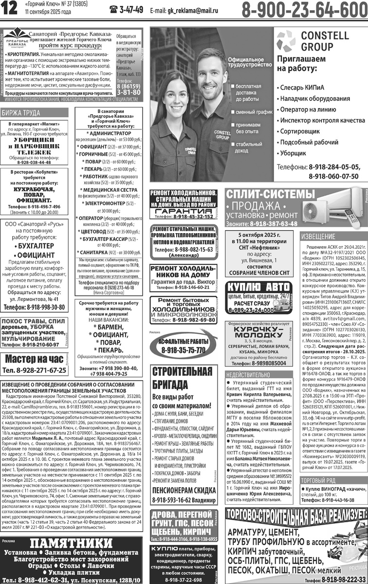 📌 Друзья, делимся с вами полезной страничкой газеты и напоминаем, что вы можете разместить свои объявления о вакансиях, услугах, рекламные модули, поздравления на страницах газеты "Горячий Ключ". 🏠 Адрес редакции: ул. Набережная, 1. ☎️ Тел. 8-900-23-64-600.