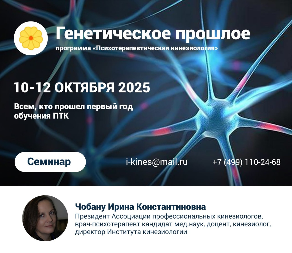 Дорогие друзья!🌿 Приглашаем на семинар "Генетическое прошлое", который будет проведен с 10 по 12 октября 2025 года Семинар проведет Чобану Ирина Константиновна — Президент Ассоциации профессиональных кинезиологов, врач-психотерапевт кандидат мед.наук, доцент, кинезиолог, директор Института кинезиологии Удивительный семинар о наших предках и информации, которую мы от них получили. Мы познакомимся и выровняем воспоминания и энергию, идущую к нам из глубины нашего генетического кода. Те события и переживания, через которые прошли наши предки, живы в нашей генетике и влияют на нас, мы научимся работать с ней 👍 Этот семинар поможет восстановить положительные связи с нашими предками, уважать их и опираться на накопленное ✅ А главное – уберет негативное влияние прошлого Подробнее о семинаре можно узнать в личных сообщениях группы ВК, в чате Института кинезиологии или по ссылке — https://i-kines.ru/geneticheskoe-proshloe/
