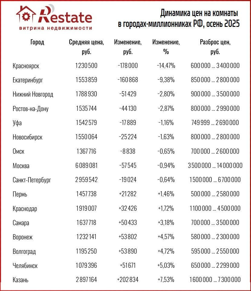 По данным Restate, за квартал больше городов показали рост (7 из 16), но крупные обвалы в Красноярске (−178 тыс. ₽) и Екатеринбурге (−161 тыс. ₽) полностью «съели» позитив.