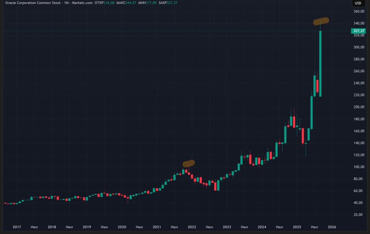 В ответ на пост Предыдущий blow-off top в Oracle случился в декабре 2021, перед началом медвежьего 2022 [сдувания ковид-пузыря] Скачок в среду на +40% [самый мощный однодневной рост бумажки за 30 лет] был связан с потрясающим прогнозом, основанном на ИИ-хайпе Гендиректор Сафра Кац сообщила, что компания подписала контракты с тремя разными клиентам, увеличив прогноз будущих доходов аж на $317 млрд Теперь появились детали По словам источников WSJ, OpenAI подписала контракт с Oracle на закупку вычислительной мощности на сумм $300 млрд в течение примерно пяти лет: Это огромное обязательство, которое значительно превышает текущий доход стартапа Сделка является одним из крупнейших когда-либо подписанных контрактов в сфере облачных технологий и отражает то, как расходы на центры обработки данных ИИ достигают новых максимумов, несмотря на растущие опасения по поводу потенциального пузыря Контракт с Oracle потребует 4,5 гигаватт электроэнергии, что примерно сопоставимо с объемом электроэ