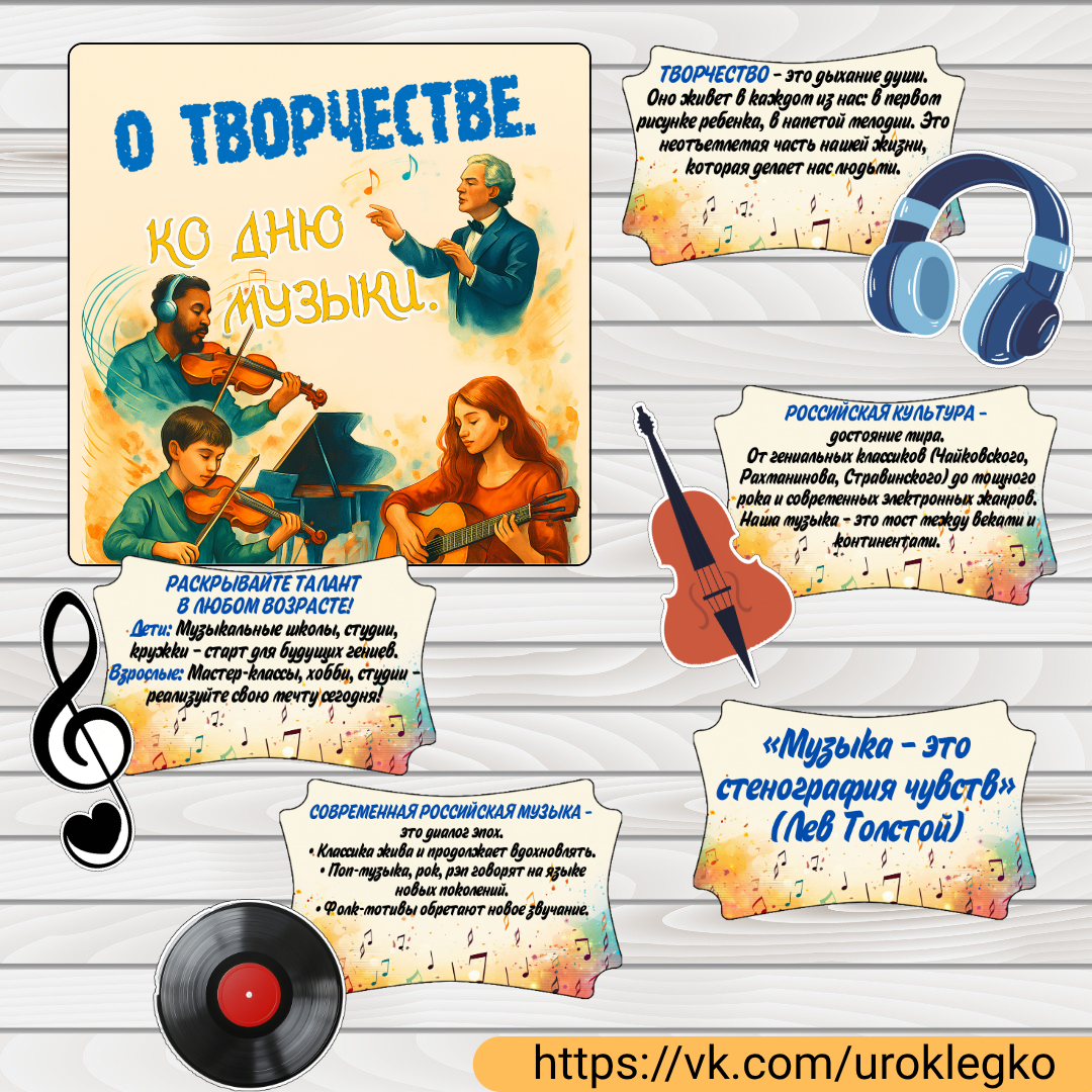 3. 4 тематические иллюстрации (4 листа А4). Данный набор для оформления понадобится для создания в школе праздничной и образовательной атмосферы в преддверии Международного дня музыки. Он позволит учителям музыки, МХК или организаторам внеклассной работы быстро и эффектно оформить тематический стенд, кабинет или рекреацию, чтобы визуально познакомить учащихся с миром музыкального искусства, вдохновить их на собственное творчество и подчеркнуть важность музыки в жизни человека. Плакат станет ярким центральным элементом, тематические блоки предоставят структурированную информацию о разных аспектах творчества, а иллюстрации сделают экспозицию визуально насыщенной и запоминающейся для школьников всех возрастов. Где можно скачать: https://vk.com/uroklegko #образование #школа #СПО #разговорыоважном #плакат #классныйруководитель