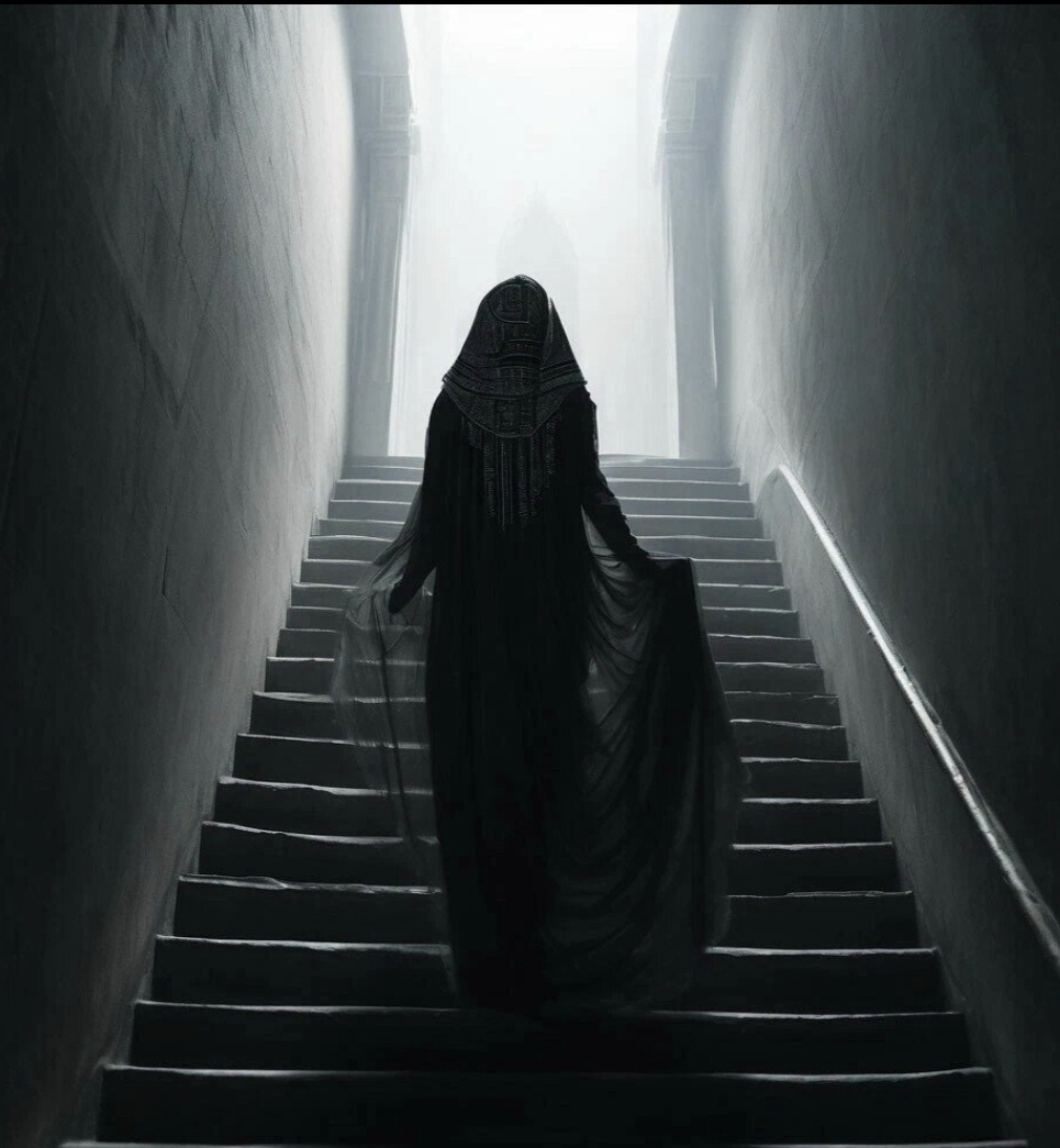 Я решила не поворачиваться, а побежала вниз. И только на втором этаже повернулась и посмотрела на лестницу выше меня. Всю лестницу я не видела, только нижнюю часть, там где ступеньки. Там стояло что-то в чёрном, до пола. Я увидела нижний край чёрной одежды, до ступеньки длинной.