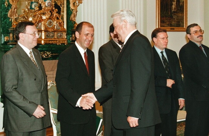 Олигархи. Борис Ельцин приветствует ряд видных олигархов: Гусинского, Фридмана, Ходорковского и Потанина. Олигархи использовали свои связи в правительстве и администрации президента, чтобы сколотить свои огромные состояния.