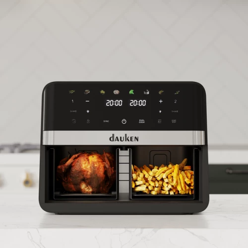 Представьте: обычная кухня, где стоит духовка и несколько приборов, которые занимают кучу места, и всегда кажется, что места мало, а времени на готовку — ещё меньше. Каждый день похож на предыдущий: быстрые завтраки, ужины «на скорую руку» или готовая еда из магазина. Самое неприятное, когда начинаешь осознавать, что еда получается однообразной, а кухня захламленной. Всё меняется в тот момент, когда на кухне появляется Dauken AG920 AirFlex DuoCook! Выбирая Dauken AG920 AirFlex DuoCook с первых же дней ясно: это не просто прибор, а правильный и рациональный выбор, который полностью меняет подход к готовке. Это — новая глава в жизни. Корпус глубокого чёрного цвета с металлическими акцентами, прозрачная дверца из закалённого стекла — аэрогриль выглядит стильно и современно. Его не хочется прятать в шкаф: наоборот, он украшает интерьер. Кухня сразу кажется более аккуратной и продуманной. И ещё одно открытие: с появлением Dauken AG920 AirFlex DuoCook место освобождается. Он заменяет сразу